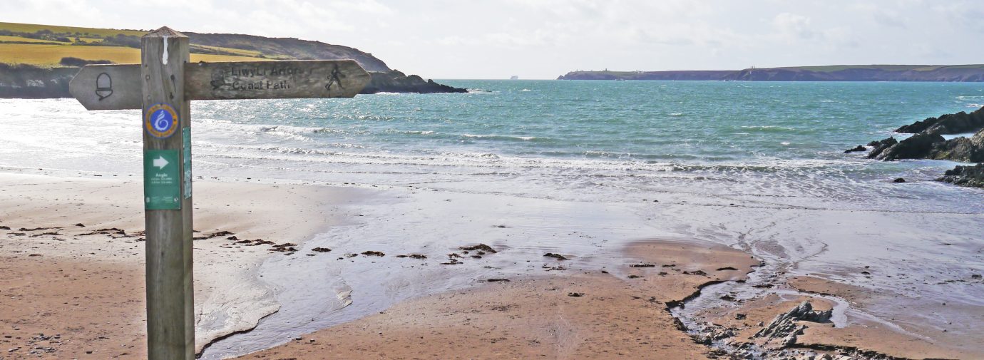 The seaward start of this footpath is now west of that marked on most maps, following the valley. This path can be used to cross to Angle Bay, to enable a full day walk of Angle Peninsula.