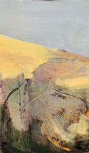 Jane Boswell’s paintings are expressive and semi-abstract, often incorporating collaged elements.
