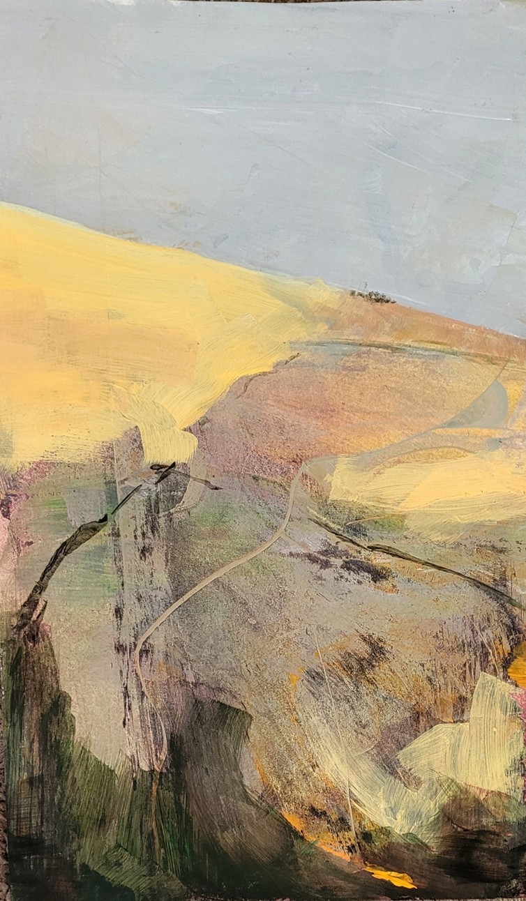 Jane Boswell’s paintings are expressive and semi-abstract, often incorporating collaged elements. These artworks express the joy and deep connection she feels with the coast and countryside of Pembrokeshire. Exploring both landscape and seascape through paint, she often adds elements of poetic language both within and alongside her creations. Recently, Jane has been producing a series of paintings inspired by the colours and changing weather patterns of the Preseli Hills. These small works evoke the spaciousness of the hills, and the ancient stones found there, often with the addition of the written word, in both English and Welsh.