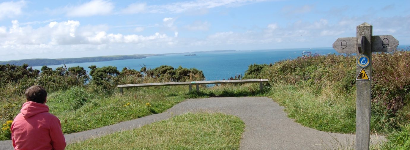 Leave car park on path towards the sea. Follow path around first viewpoint onto the Coast Path. A little way beyond the third seat there is a 1:15 gradient for 10 metres.