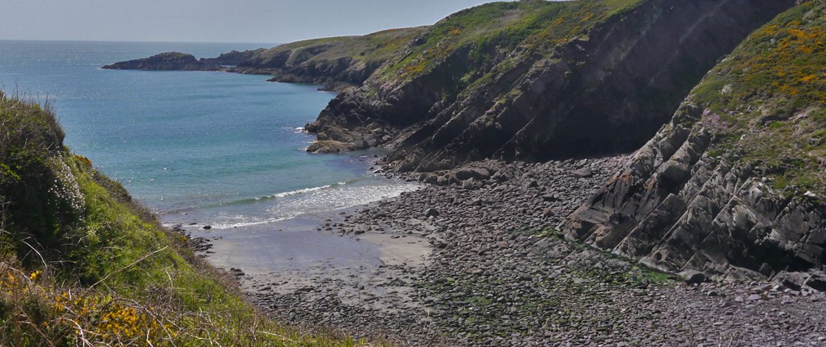 Caerbwdi south-facing and quite sheltered, and usually quiet apart from the occasional passing walker on the Pembrokeshire Coast Path. The distinctive purple sandstone of Caerbwdi was quarried in Medieval times to provide the fine edging stone for St Davids Cathedral.