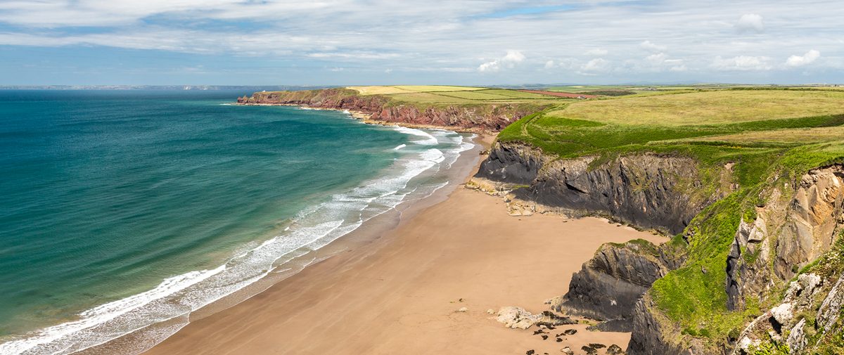 Passing inlets with evocative names Brandy Bay and Dutch Gin – the route arrives at narrow Foxes’ Holes, where the cliffs change. From there on the rock below your feet is Old Red Sandstone; see the difference in the rich-red soil of nearby fields.