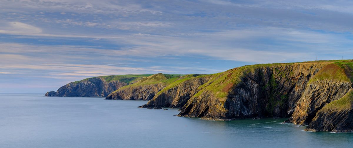 The dramatic folding to the north, of (Pen-yr-Afr) can be seen on the return route. Much of the Coast Path was cut out by machine in the 1960s and here that profile can be easily seen. Although the path is fairly wide, one needs to be aware of the sudden drop to seaward.