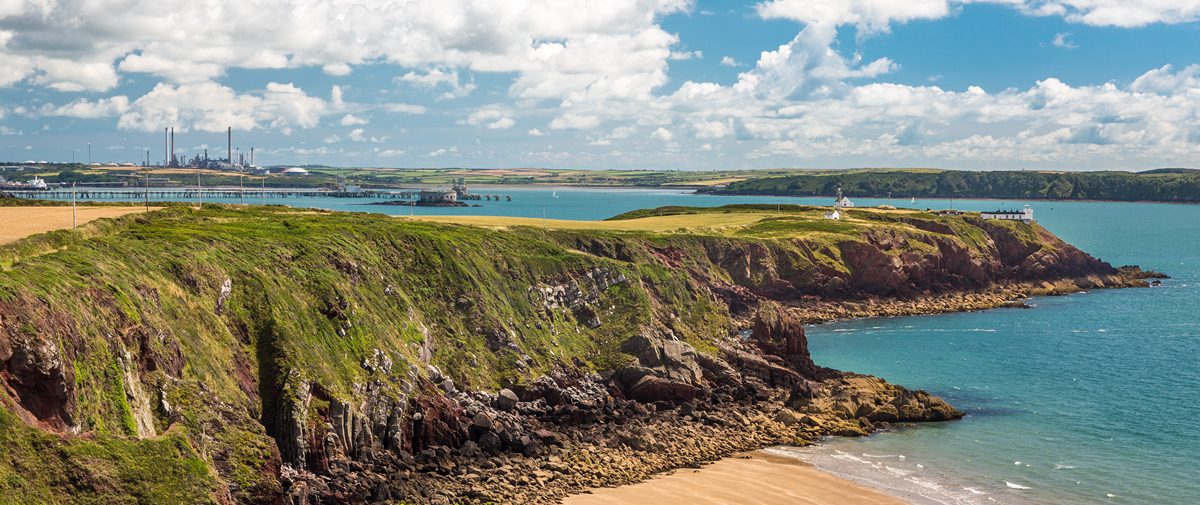 Great Castle Head offers excellent views of Milford Haven Waterway, the port and the refinery. The port was founded in the late 18th century and among the early settlers were whalers from Nantucket, refugees from the American War of Independence.