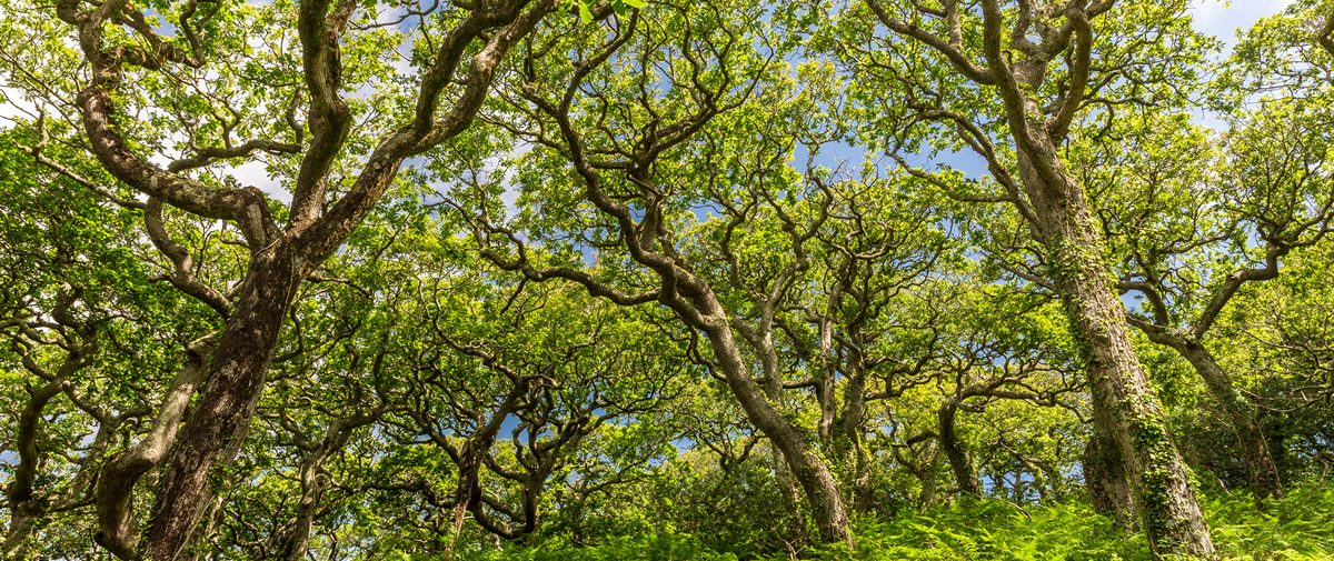 Mostly sessile oak, which are caked with over 200 species of lichen, the woods also contain holly, rowan and the rare wild service tree (a close relative of the rowan) which can be made out easily in autumn by its rich red foliage against the yellow and brown of the turning oak.
