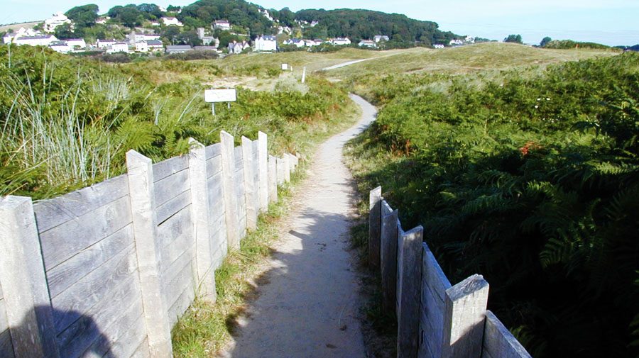 At the end of the tarmac surface, the path turns to the right to pass through the dunes to the beach.